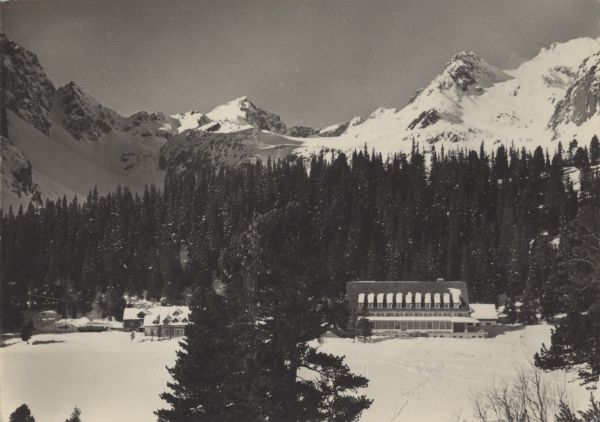 Hotel górski nad Popradzkim Stawem zim±. W tle Koprowy Wierch i Wołowiec Mięguszowiecki.