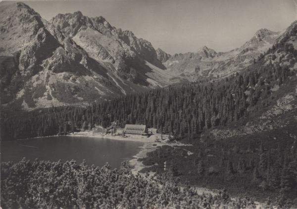 VYSOKÉ TATRY. Popradské pleso (1513 m) s chatou kpt. Morávku. Vµavo Satan (2432 m), uprostred Kôprovský ątít (2370 m), vpravo ątít Oµgy (2212 m).
