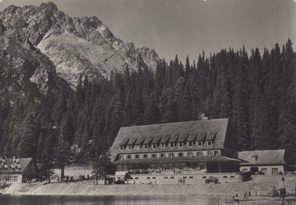 Hotel górski nad Popradzkim Stawem w Dolinie Mięguszowieckiej. W tle Pośrednia Baszta i Szatan.