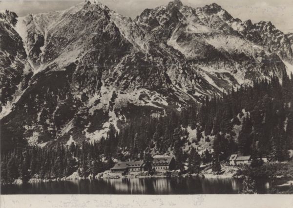 Popradzki Staw w Dolinie Mięguszowieckiej, nad brzegiem widoczny hotel górski. W tle Grań Baszt (Skrajna Baszta, Pośrednia Baszta, Zadnia Baszta i Szatan).