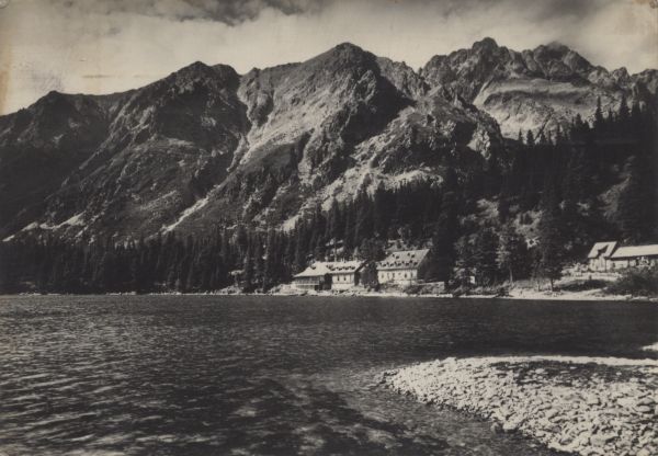 Popradzki Staw w Dolinie Mięguszowieckiej, nad brzegiem widoczny hotel górski. W tle Grań Baszt (Pośrednia Baszta i Szatan).