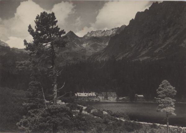 Popradzki Staw w Dolinie Mięguszowieckiej, nad brzegiem widoczny hotel górski. W tle Wołowiec Mięguszowiecki.