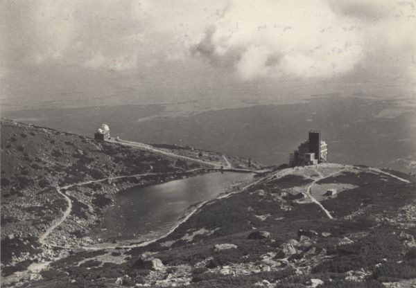 TATRY WYSOKIE - Łomnicki Staw, w lewo obserwatorium astronomiczne SAN, w prawo stacja kolei linowej, restauracja i hotel Encián.