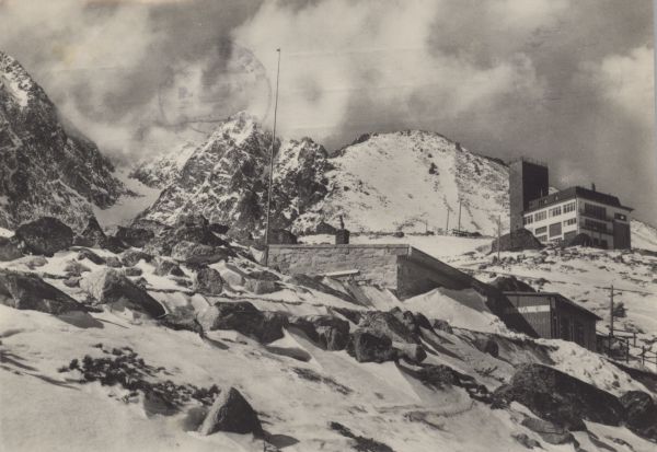 Po¶rodku pocztówki widać Schronisko Łomnickie. W głębi po prawej stronie hotel Encián. W tle zimowy pejzaż Tatr Wysokich. Od lewej: Łomnica, Kieżmarski Szczyt i Huncowski Szczyt.