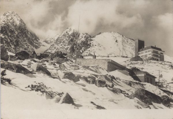 Po¶rodku pocztówki Schronisko Łomnickie. W głêbi po prawej stronie hotel Encián. W tle zimowy pejzaż Tatr Wysokich. Od lewej: Łomnica, Kieżmarski Szczyt i Huncowski Szczyt.