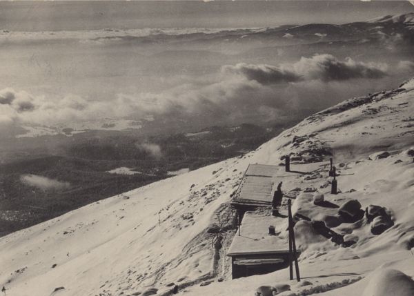 Po prawej stronie przysypane ¶niegiem Schronisko Łomnickie. Widok z góry, widoczne dachy schroniska. W tle morze mgieł.