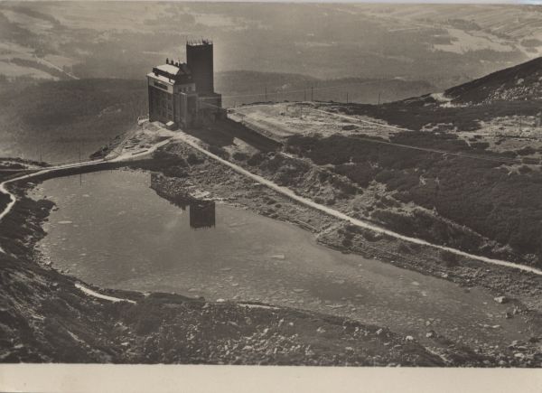Na pierwszym planie Łomnicki Staw. W centrum budynek hotelu Encián i stacja kolei linowej na Łomnicę.