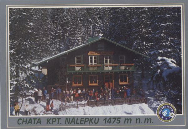 Turyści przed Schroniskiem Zamkowskiego w Dolinie Małej Zimnej Wody zimą. Pod zdjęciem nadruk: CHATA KPT. NÁLEPKU 1475 m n. m., po prawej stronie logo miasta VYSOKÉ TATRY.