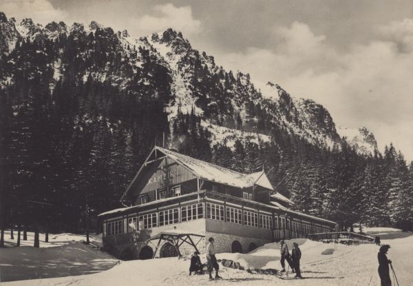 Schronisko pod Kozicą na Polanie Staroleśnej w zimie. Przed budynkiem narciarze. W tle zbocza Sławkowskiego Szczytu.