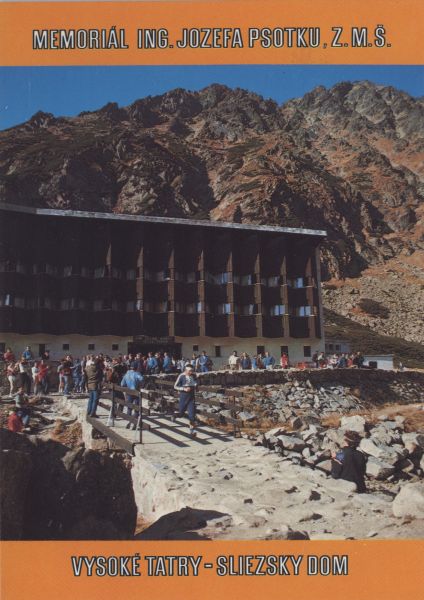 Hotel górski Śląski Dom w Dolinie Wielickiej. W tle Gerlach. Memoriał inż. Jozefa Psotka. Na marginesach nad zdjęciem i pod nim tytuł.
