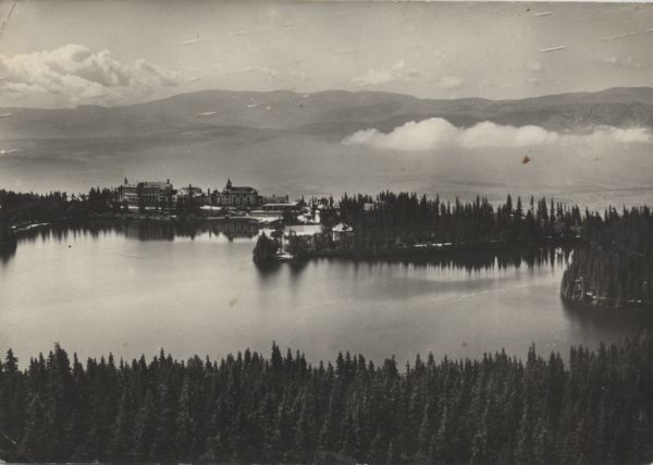 Na pierwszym planie las i Szczyrbskie Jezioro, w głębi zabudowania - sanatoria i domy wypoczynkowe. W tle Niżne Tatry.