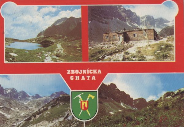 Nowole¶na Grań, Starole¶ny Szczyt, Zwalista Turnia, Baniasta Turnia i Mała Wysoka. Pomiędzy zdjęciami napis: Zbojnícka chata i herb.