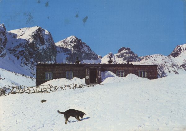 Schronisko Zbójnickie w Dolinie Staroleśnej zimą. W tle Baniasta Turnia i Mała Wysoka. Przed budynkiem bawiący się pies.