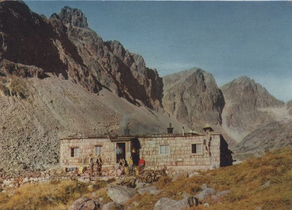 Schronisko Zbójnickie w Dolinie Staroleśnej. W tle Staroleśny Szczyt, Baniasta Turnia i Mała Wysoka. Przed budynkiem turyści.