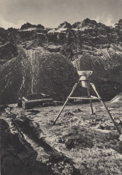 Widok na schronisko Zbójnickie w Dolinie Staroleśnej. W tle Sławkowska Grań i Nowoleśna Grań. Na pierwszym planie totalizator (przyrząd meteorologiczny do pomiaru sum opadów atmosferycznych).