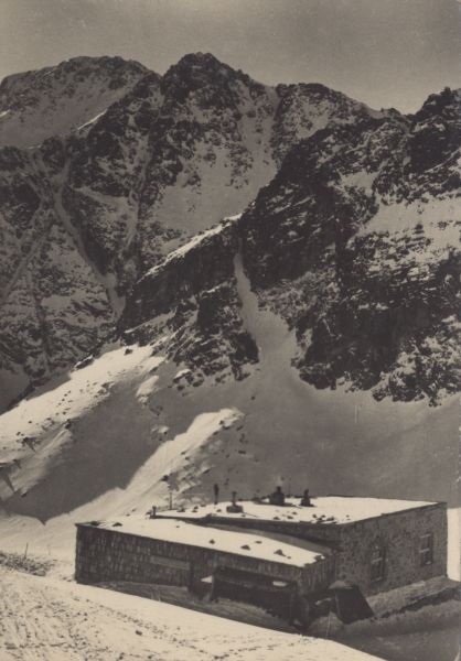 Schronisko Zbójnickie w Dolinie Starole¶nej zim±. W tle od lewej: Sławkowski Szczyt, Sławkowska Kopa i grań Skrajnej Nowole¶nej Turni.