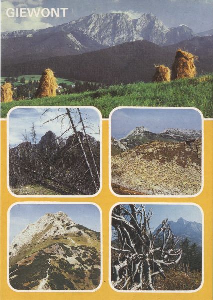 Pocztówka 5. elementowa. Widoki na Giewont: Z pasma Gubałówki, na pierwszym planie kopy siana