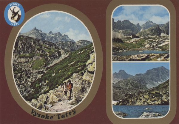 Pocztówka 3. elementowa: Szlak do Schroniska Zbójnickiego w Dolinie Staroleśnej. Schronisko Téryego w Dolinie Małej Zimnej Wody. Dzika Turnia i Świstowy Szczyt nad Długim Stawem Staroleśnym w Dolinie Staroleśnej. U góry po lewej stronie głowa kozicy otoczona napisem: VYSOKÉ TATRY, na dole napis: VYSOKÉ TATRY.