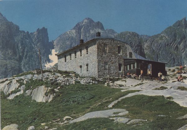 VYSOKÉ TATRY - WYSOKIE TATRY - HOHE TATRA - THE HIGH TATRAS Téryho chata (2015 m) v Malej Studenej doline, v pozadí Priečna veža (2390 m), Priečne sedlo (2352 m) a Široká veža (2461 m)