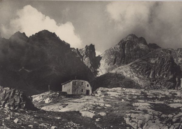 Schronisko Téryego w Dolinie Pięciu Stawów Spiskich. W tle Drobna Turnia, Sokola Turnia, Spąga, Czerwona Ławka i Mały Lodowy Szczyt. Przed nim Pięciostawiańska Kopa.
