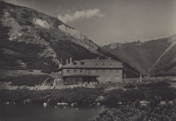 Tatry Wysokie. Schronisko Kieżmarskie w Dolinie Białych Stawów. Z lewej ściana Bielskiej Kopy, z prawej w tle grań Tatr Bielskich (Zadnie Jatki).