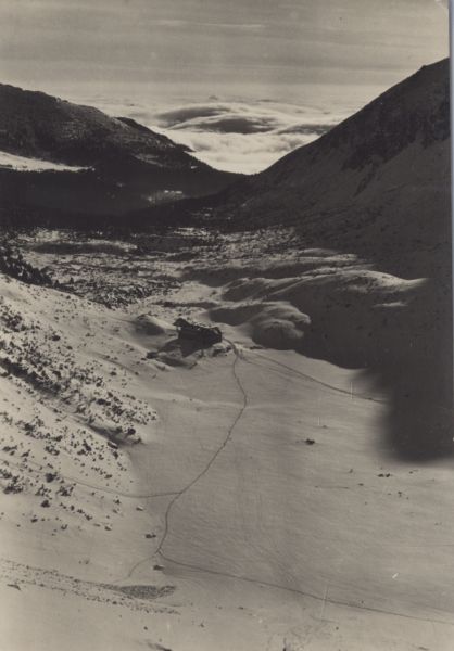 Pocztówka użyta w obiegu pocztowym, korespondencja. Logo wydawcy. Znak graficzny z tekstem: V PROSPECH CESTOVNÉHO RUCHU. Kčs 0,20. Dodatkowo pieczęć schroniska.