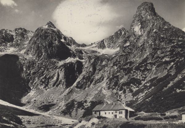 Schronisko przy Zielonym Stawie Kieżmarskim. W tle od lewej: Baranie Rogi, Czarny Szczyt, Kołowy Szczyt i Jastrzębia Turnia.
