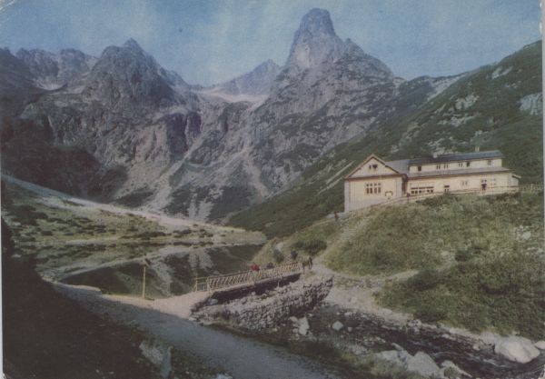 Tatrzański Park Narodowy [Słowacja] - Dolina Zielonego Stawu Kieżmarskiego, Schronisko im. Brnčala przy Zielonym Stawie Kieżmarskim. W tle od lewej Czarny Szczyt, Kołowy Szczyt i Jastrzębia Turnia. Tytuł również w języku: ros., ang., niem.