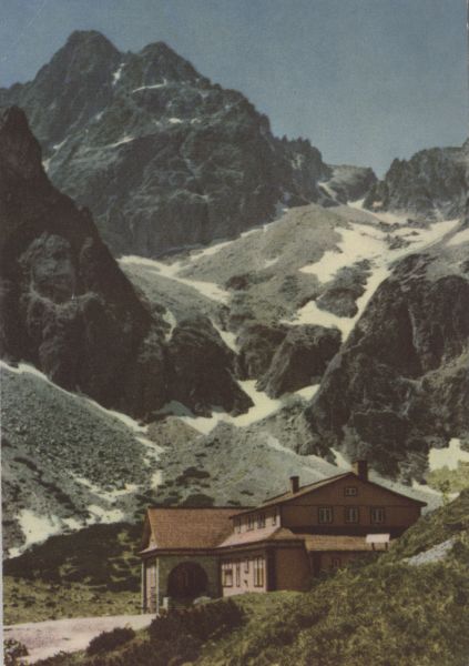 Tatry Wysokie. Schronisko im. Brnčala w Dolinie Zielonego Stawu Kieżmarskiego. Z lewej: Durny Szczyt i Mały Durny Szczyt. Tytuł również w języku: ros., niem., ang.