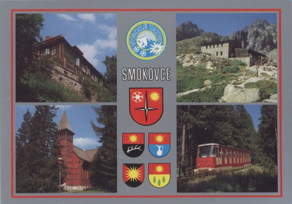 Wagon kolei linowo-terenowej na Siodełko. Pomiędzy zdjęciami logo miasta Wysokie Tatry, herby miejscowości i napis SMOKOVCE.