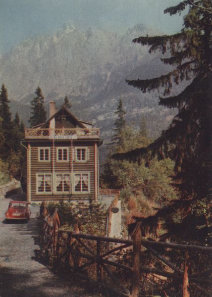 Tatrzański Park Narodowy [Słowacja]. Schronisko Bilika pod Siodełkiem. W tle Łomnica nad Dolin± Małej Zimnej Wody. Tytuł również w j. ros., niem., ang.