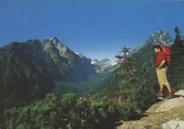 Widok na Dolinę Staroleśną z Magistrali Tatrzańskiej. Po lewej stronie Sławkowski Szczyt, po prawej Pośrednia Grań. Na pierwszym planie kosodrzewina (Pinus mugo Turra) i turysta na szlaku.