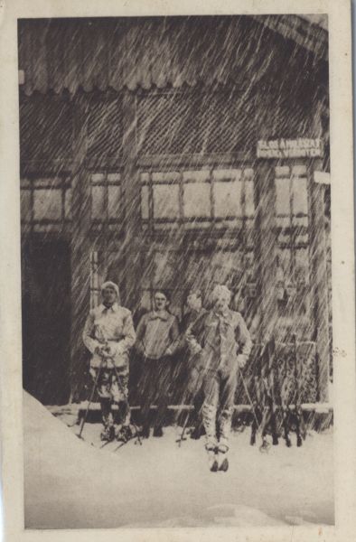 Narciarze przed wejściem do schroniska nad Popradzkim Stawem podczas śnieżycy.