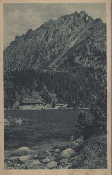 Tatry Wysokie. Schronisko KČST nad Popradzkim Stawem. W tle Kopa Popradzka. Tytuł również w języku: fr.