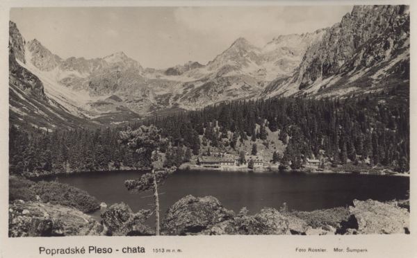 Pocztówka użyta w obiegu pocztowym, korespondencja. Dodatkowo pieczęć: "P.P. CHATA U POPRADSKÉHO PLESA 1513 m.n.m.".