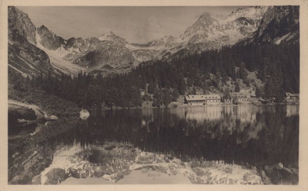 Pocztówka użyta w obiegu pocztowym, korespondencja. Logo wydawcy. Dodatkowo pieczęć: "P.P. CHATA U POPRADSKÉHO PLESA 1513 m.n.m.".