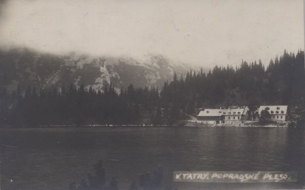 Schronisko nad Popradzkim Stawem w Dolinie Mięguszowieckiej. W chmurach Grań Baszt. Na dole po prawej stronie wpisany tytuł.