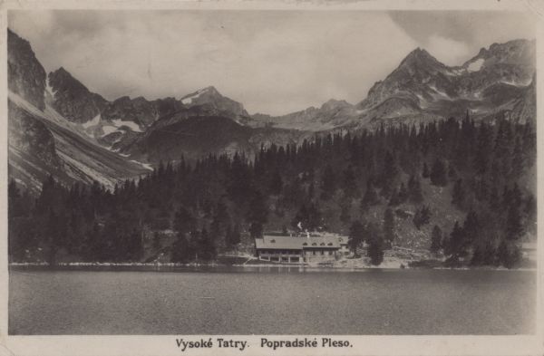 Schronisko nad Popradzkim Stawem. W tle Koprowy Wierch i Wołowiec Mięguszowiecki. Pod zdjęciem napis: VYSOKÉ TATRY. POPRADSKÉ PLESO.