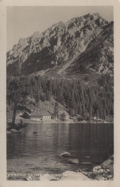 Schronisko nad Popradzkim Stawem w Dolinie Mięguszowieckiej. W tle Kopa Popradzka. U dołu zdjęcia opis: VYSOKÉ TATRY. Popradské Pleso.