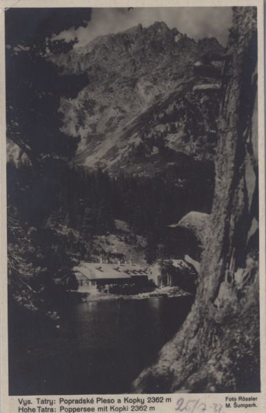 Pocztówka użyta w obiegu pocztowym, korespondencja. Dodatkowo pieczęć: "P.P. CHATA U POPRADSKÉHO PLESA 1513 m.n.m.".