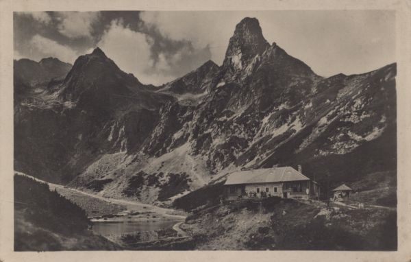 Schronisko przy Zielonym Stawie Kieżmarskim. W tle od lewej: Czarny Szczyt, Kołowy Szczyt, Jastrzębia Turnia.