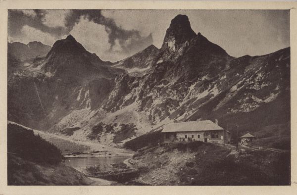 Schronisko przy Zielonym Stawie Kieżmarskim. W tle Czarny Szczyt, Kołowy Szczyt i Jastrzębia Turnia.