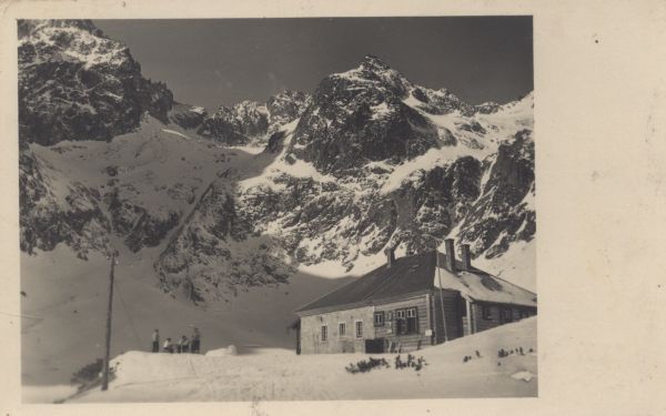 Schronisko przy Zielonym Stawie zimą. W tle Dzika Dolina i Czarny Szczyt. Przed budynkiem siedzą turyści.