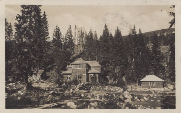 Schronisko Tardika Klubu Słowackich Turystów i Narciarzy przy Zimnej Studni na Rzeżuchowej Polanie w Dolinie Kieżmarskiej. W dole płynie Biała Woda Kieżmarska.