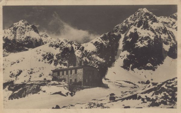 Schronisko Téryego w Dolinie Pięciu Stawów Spiskich zimą. W tle Mały Lodowy Szczyt i Lodowa Kopa.