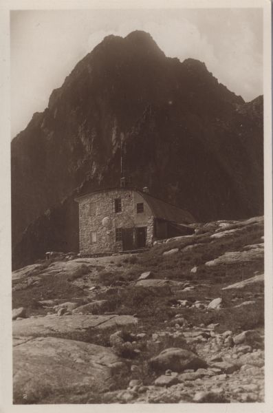 Schronisko Teryego w Dolinie Pięciu Stawów Spiskich. W tle Pośrednia Grań, pod nią Żółta Ściana.
