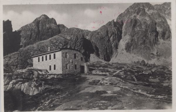 Schronisko Téryego Klubu Czesko-Słowackich Turystów w Dolinie Pięciu Stawów Spiskich. W tle Spąga, Czerwona Ławka, Mały Lodowy Szczyt, Pięciostawiańska Kopa i Lodowa Kopa.
