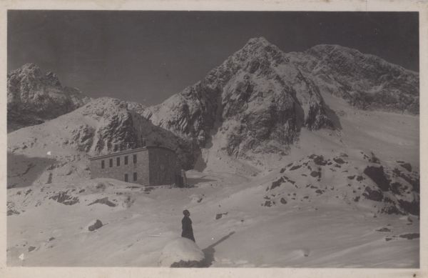Schronisko Téryego Klubu Czesko-Słowackich Turystów w Dolinie Pięciu Stawów Spiskich zim±. W tle Mały Lodowy Szczyt, Pięciostawiańska Kopa, Lodowa Kopa i Lodowy Szczyt.