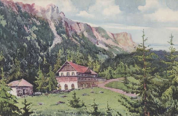 Reprodukcja obrazu Jára Sedláčka: Schronisko pod Kozicą na Polanie Staroleśnej, w tle Sławkowski Szczyt.