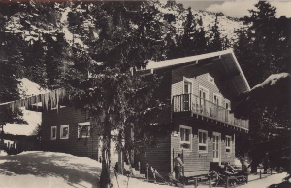 Schronisko Zamkowskiego w Dolinie Małej Zimnej Wody. Przed budynkiem narciarze.
